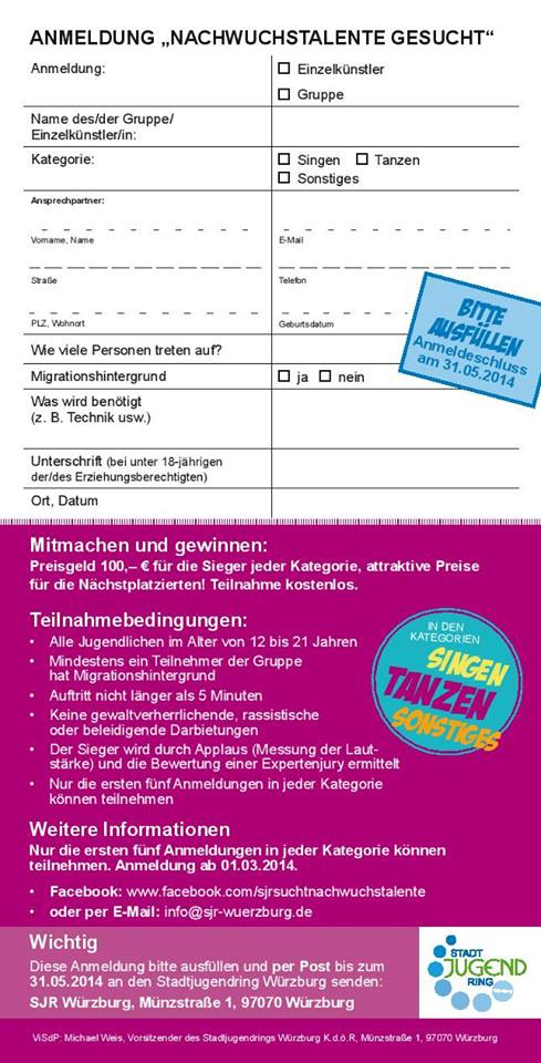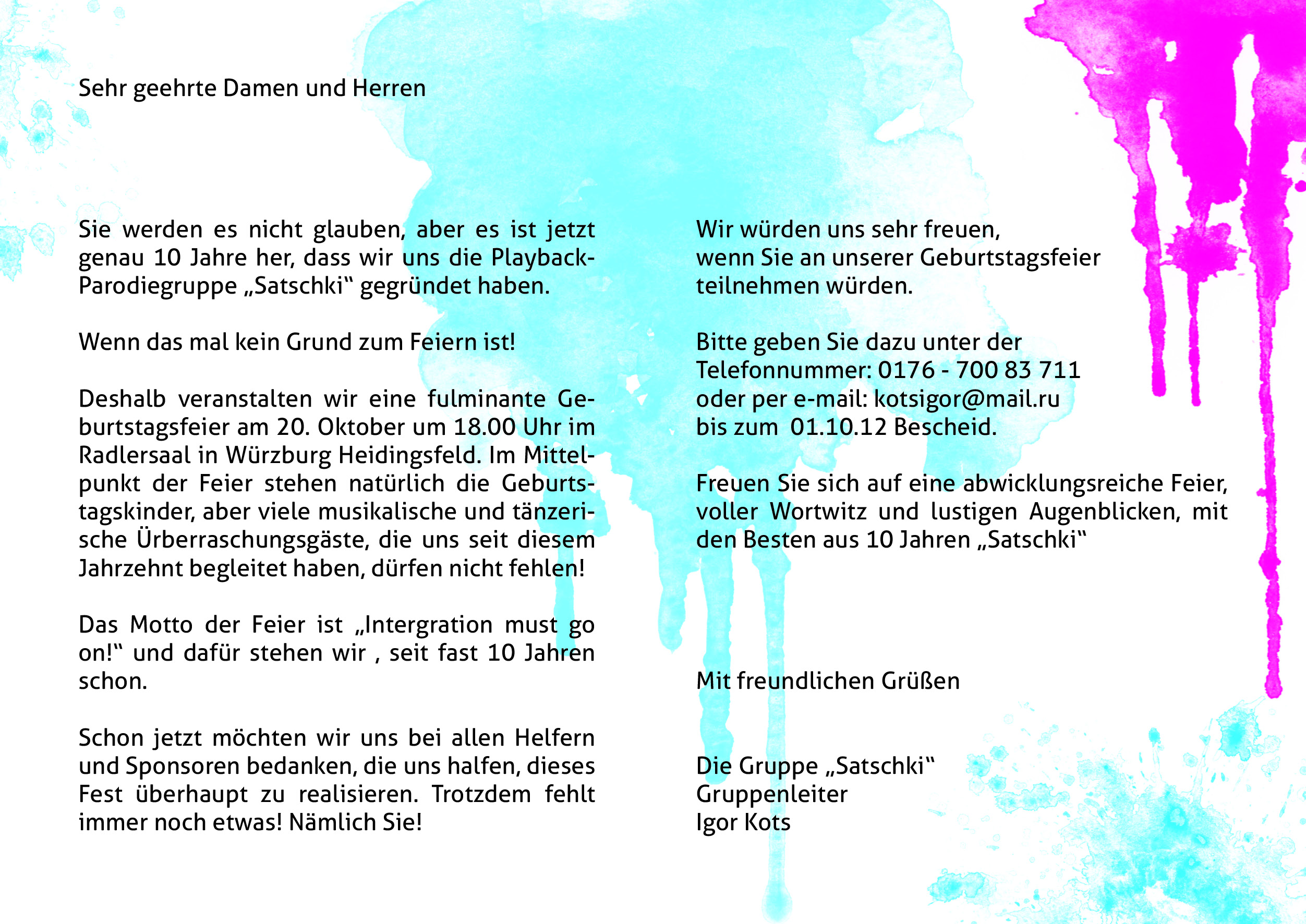 Sponsoren gesucht Unterstützung der Gruppe "Satschki" Unsere Gruppe wurde 2002 gegründet und möchte in diesem Jahr ihr 10-jähriges Bestehen feiern. Dazu haben wir uns schon ein Programm einfallen lassen, welches unter dem Motto "Integration must go on" steht. Allerdings fehlen uns als ehrenamtliche Gruppe die finanziellen Mittel zur Realisierung dieses Plans. Eine Aktion wie diese kommt in der Regel nicht ohne Unterstützung anderer aus, da wir unsere Tätigkeit ehrenamtlich ausüben. Nun suchen wir nach Sponsoren, die uns helfen.Mit eurer finanziellen Unterstützung ermöglichen Sie uns den Druck von Flyern und Plakaten, auf denen Sie mit Ihrem Logo erwähnt werden. Zusätzlich geben wir Ihnen die Möglichkeit, während unserer Veranstaltung ein paar Worte auf der Bühne zu sagen. Bei Fragen oder Anregungen steht Herr Kots (Leiter der Gruppe) Ihnen gerne unter der folgenden Nummer zur Verfügung: 0176-70083711